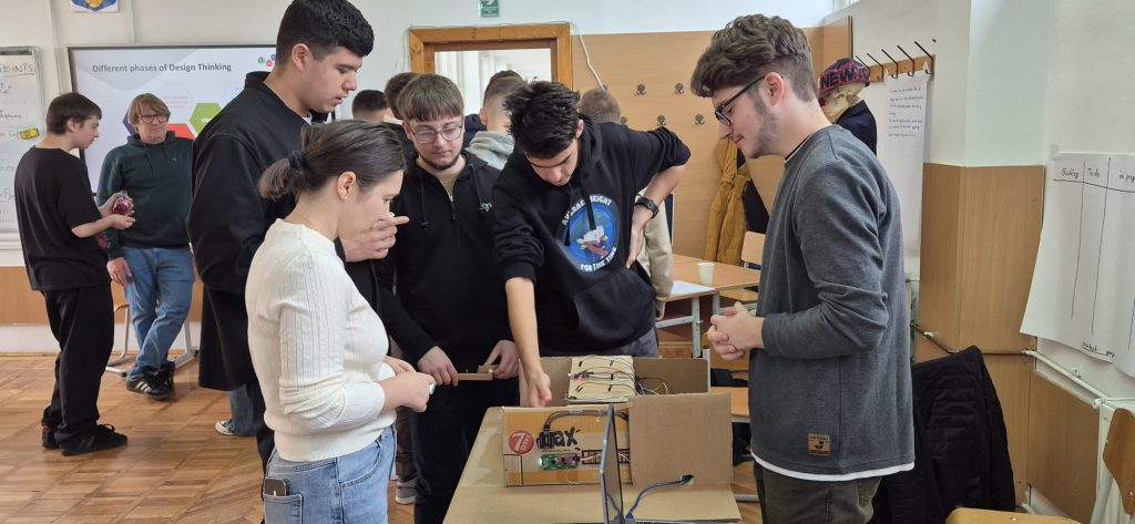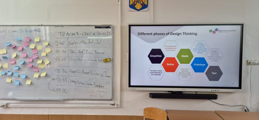 În perioada 07.10.2025 – 17.10.2025, un grup de 22 de elevi și 5 profesori de la Berufliche Schule ITECH Hamburg, Germania, școală parteneră a Colegiului Tehnic Energetic Sibiu, a efectuat o mobilitate în cadrul școlii noastre. Cu ocazia acestei mobilități, s-a desfășurat în școala noastră un workshop în domeniul Design Thinking. La acest workshop, care a avut loc zilnic de la ora 9 la ora 14, au participat și 23 elevi și 8 profesori de la Colegiul Tehnic Energetic Sibiu (Popa Virginia, Soare Constanța, Jinariu Monica, Velțian Vasile Gheorghe, Tatu Camelia Maria, Teleanu Amelia Diana, Stoica Aurel Marius și Volosciuc Sorin Dan). Coordonați de profesorii din Germania (Struve Karen Mathilde, Brandtner Anna Katharina, Stiehm Dominik, Tobias Schwalbe și Dirk Jäger), elevii împărțiți pe echipe mixte din cele două școli, Berufliche Schule ITECH Hamburg și Colegiul Tehnic Energetic Sibiu, au realizat, folosind tehnica AGILE, câte un proiect destinat rezolvării unei anumite probleme din tematica aleasă. Tematica proiectelor a fost „SMART Sustainable Schools”. S-au folosit numeroase metode inovative: metoda SCRUM, jocuri AGILE pentru lucrul în echipe, brainstorming, metoda proiectului etc. Scopul final al workshopului a fost realizarea unui prototip al soluției de rezolvare a problemei identificate. În acest scop s-au utilizat laptopuri, platforme online și echipamente electronice (Arduino UNO, Raspberry Pi). Echipele și-au prezentat rezultatele în data de 16.10.2025. Aceste metode colaborative de lucru, care au avut rolul de a îmbunătăți pregătirea profesională și de a pregăti mai bine elevii pentru piața muncii, au avut un impact pozitiv asupra participanților la proiect.